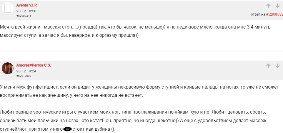 В результате фут-фетишист втихаря восторгается ногами своей партнерши, но не может в полной мере реализовать свою страсть. Неплохой выход – поискать себе пару на специализированных форумах, например: