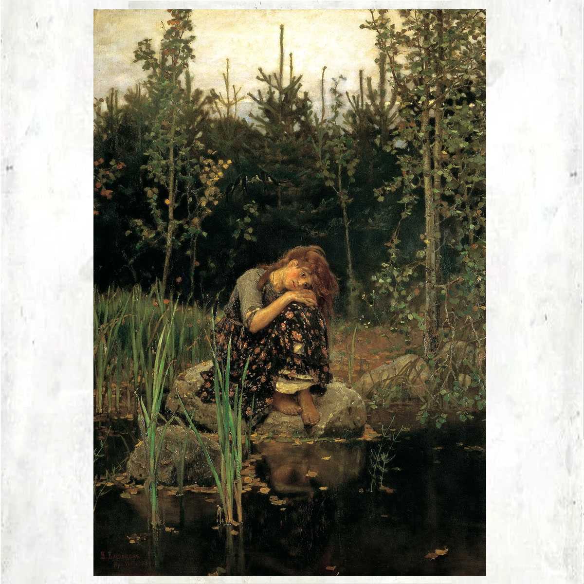 Сестрица Аленушка, уставшая от поисков потерявшегося братца Иванушки, в сиротливой позе сидит на большом камне, грустно склонив голову у мрачного пруда в дремучем хвойном лесу. Всё время не покидают Аленушку тревожные мысли о том, что не уследила за единственным братцем, и сама природа грустит вместе с ней. Аленушка тесно взаимосвязана с природой, ни один фрагмент не отвлекает зрителя от главного, в то же время каждая деталь картины — это материал для задумчивых размышлений.