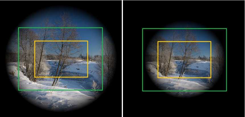 Слева объектив для фулфрейма, справа объектив для кропа. Зеленая – фулфрейм-матрица, желтая – кроп-матрица.