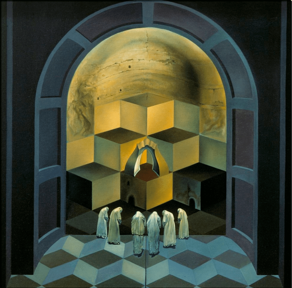 Дали, достигнув средних лет, последовал примеру своего отца, отрёкшегося от атеизма и ставшего примерным католиком. Начиная с 1949 года, художник пишет картины на религиозные темы. В том же году он удостоился аудиенции у Папы Пия XII. В Испании существуют давние и сильные традиции религиозной живописи. Дали видел себя их продолжателем, однако трактовал знакомые темы — Распятие Христа, Тайную вечерю, Деву с младенцем — очень необычно. Это вызывало разноречивые толки. Американский коллекционер Честер Дейл, выставлявший в нью-йоркском музее Метрополитен картину Дали «Распятие», 1951 год, назвал её «очень честной и по-настоящему великой». Американский критик Джон Кэнедей, напротив, посчитал это полотно «вульгарным проявлением нездорового эротизма». Точно так же он охарактеризовал и «Тайную вечерю», 1955 год.