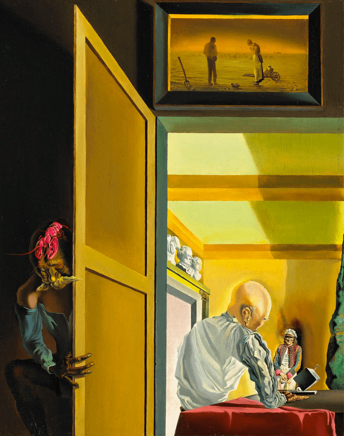 Источники вдохновения Дали часто находил в прошлом. В ряде его картин прослеживается влияние художников XVII века Веласкеса и Вермеера. «Череп Сурбарана», 1965 свидетельствует о диалоге и с этим испанским художником той же эпохи. Была одна картина, занимавшая Дали всю его жизнь. Это работа французского художника XIX века Жана Франсуа Милле «Анжелюс». Дали написал эссе (1933) и книгу (1963) о ней. Кроме того, он создал несколько пародийных откликов на неё — в частности, полотно «Гала и Анжелюс Милле перед скорым прибытием конической анаморфозы», 1933. Дали радикально пересмотрел оригинал, интерпретировав религиозный сюжет как эротический. Художник считал, что на картине Милле мужчина держит шляпу, чтобы скрыть эрекцию, а в женщине видел «эксгибиционистскую чувственность девственницы, в позе охотящегося жука-богомола ожидающей акта насилия».