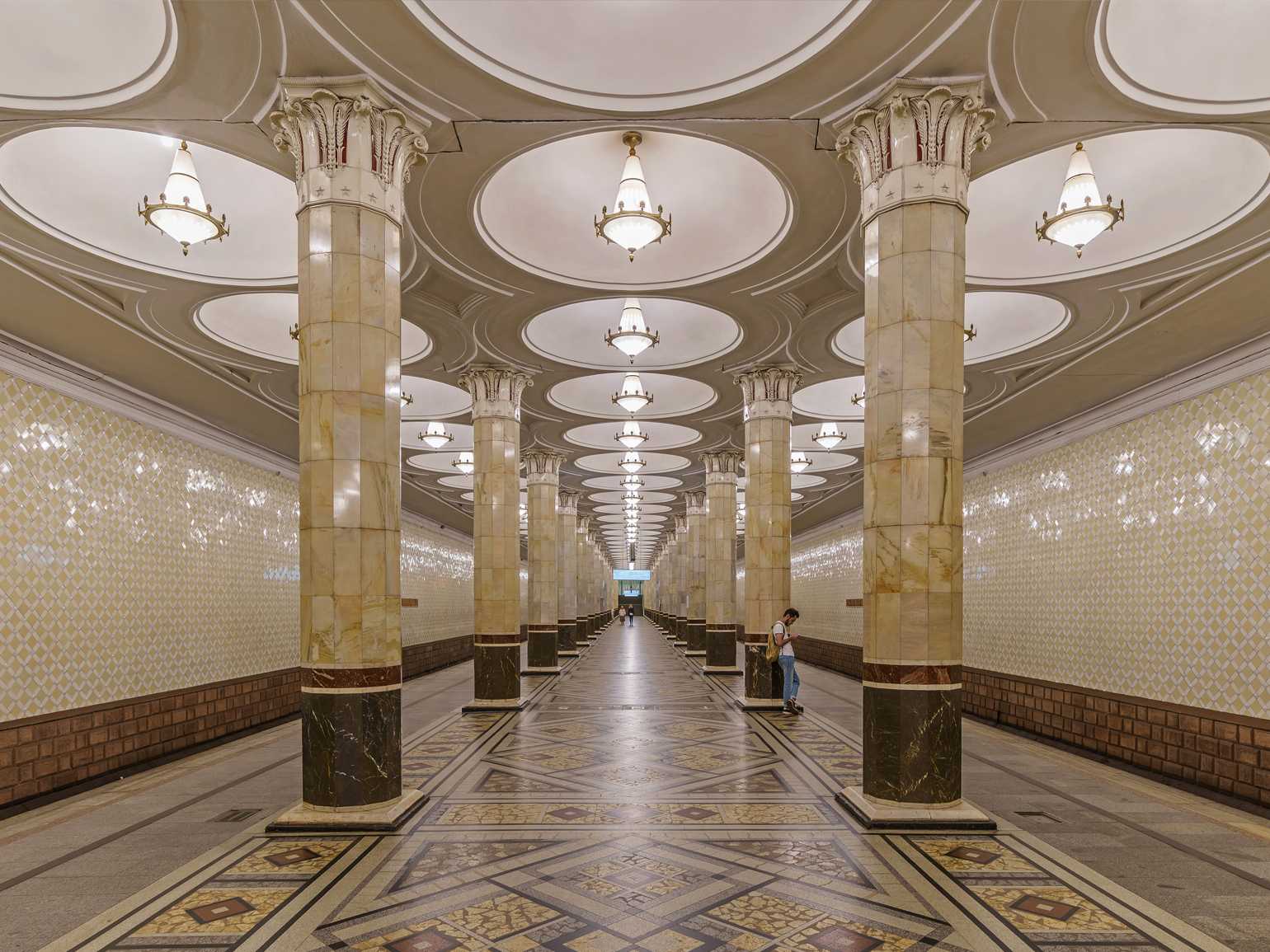Второй важный проект СССР того времени — московский метрополитен, решение о строительстве которого тоже было принято в 1931 году. Первая ветка была построена за рекордные четыре года. Образ станций — новая советская тоталитарная эстетика, слияние классики с национальными особенностями вошедших в СССР государств.