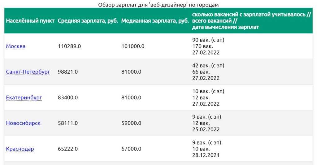Зарплаты веб-дизайнера по городам. Источник