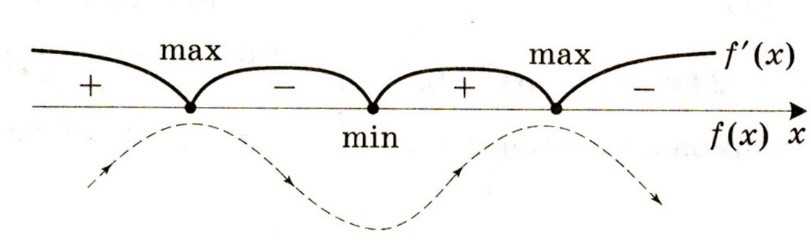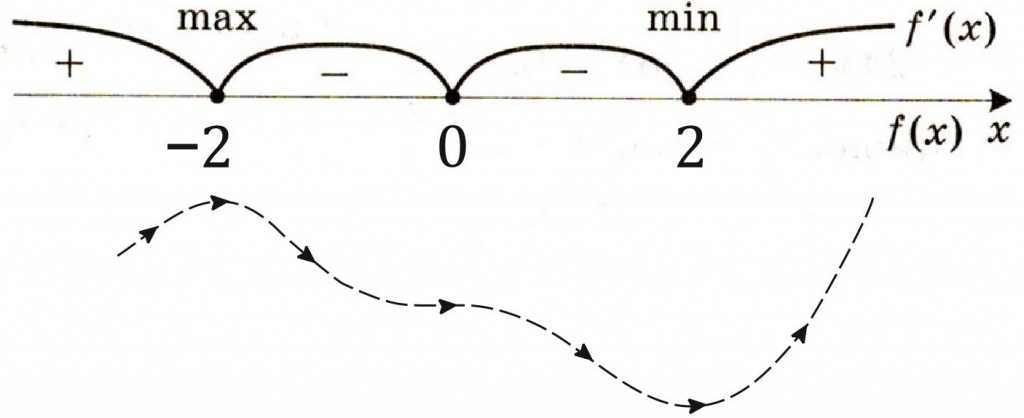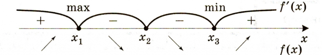 Изображая на оси точки в которых производная равна нулю – масштаб можно не учитывать. Поведение функции можно показать так, как это сделано на рисунке ниже. Так будет очевиднее где максимум, а где минимум.