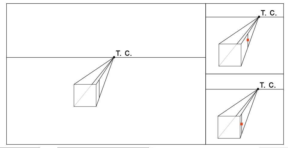 Зададим точку схода (Т.С.) на линии горизонта. Когда мы рисуем по воображению, мы ее задаем произвольно. При натурном рисовании, она зависит от нашей точки зрения и определяется по параллельным прямым в изображаемом объекте.