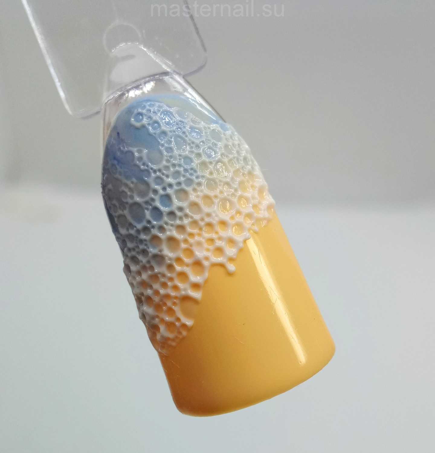 В результате у меня получился гель-лак с объемной пеной. Также можно сделать маникюр пузыри пеной, но перекрытый.