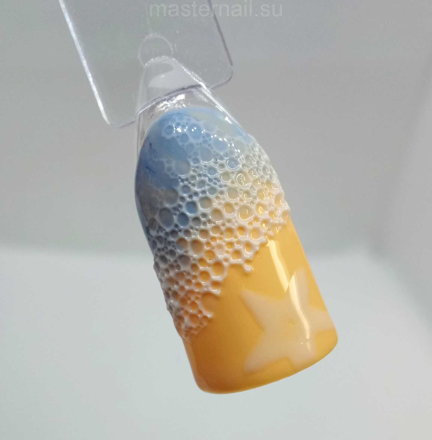 Идей маникюра с пеной может быть очень много. Но больше всего подобный пузырьковый маникюр ассоциируется с пеной морской. И поэтому летом, как мне кажется, появится много вариантов «пляжных» дизайнов в этой технике. Я пошагово покажу, как я делала два варианта рисунка в морской тематике. Первый из них с морской волной.