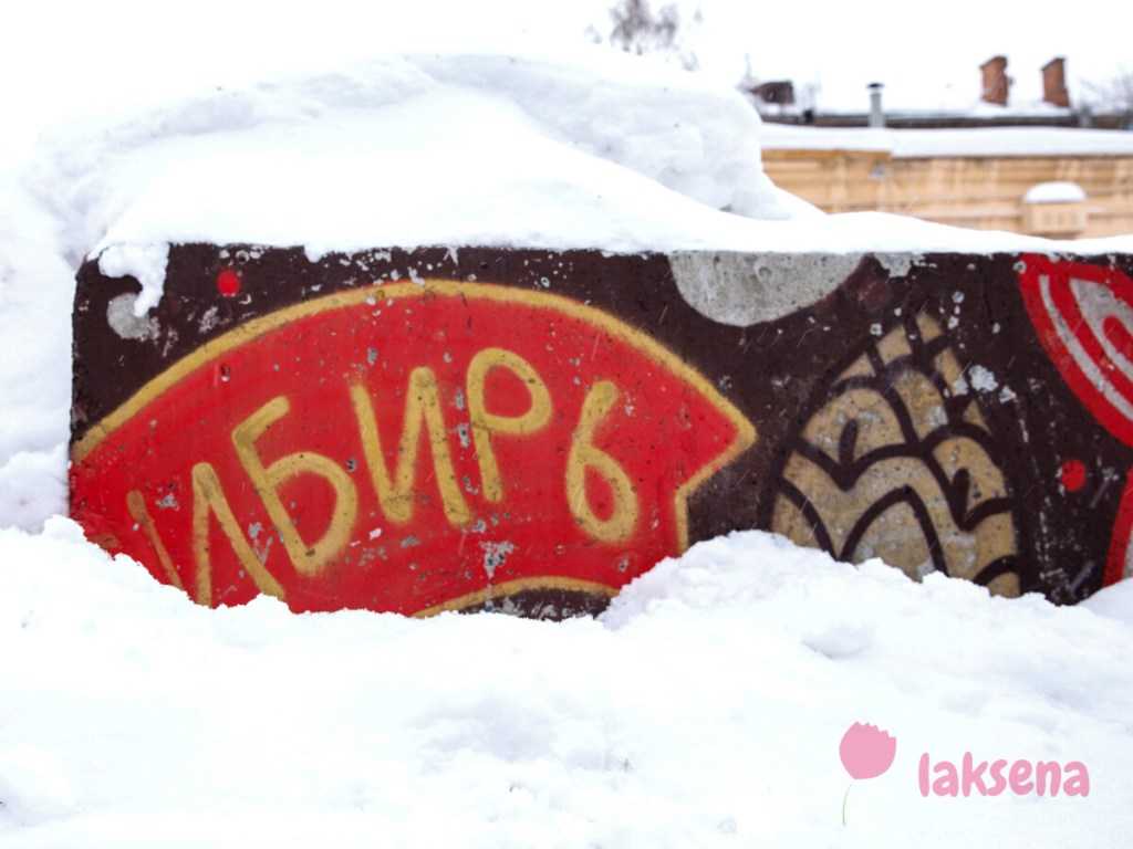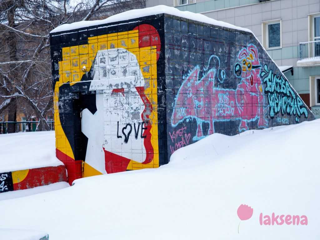 Делаем пару шагов, и … Сразу и не скажешь, что это привычное серое овощехранилище. Каждая сторона этого строения оформлена в своем стиле. Первой нас встречает граффити Девушка, автор работы Алена Катана. Художницу вдохновили строчки из песни: «Солнце так устало светить нам целый день и сейчас спит под колыбельную Flёur».