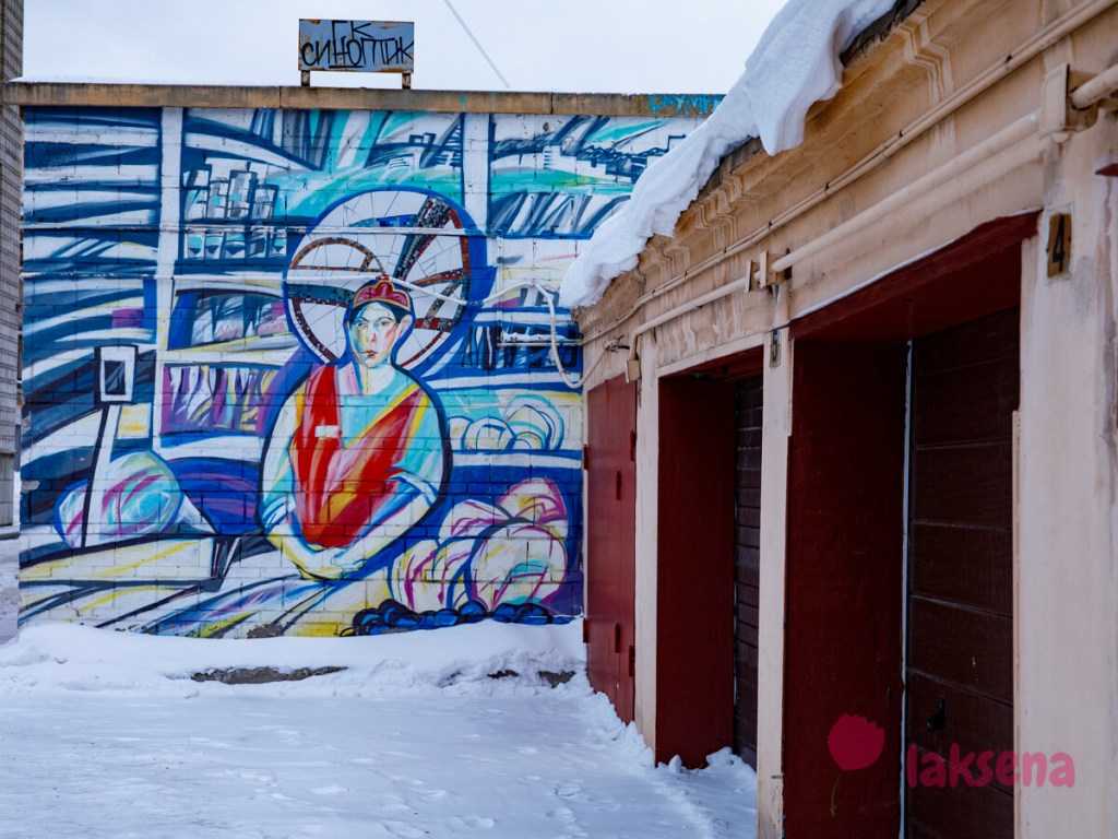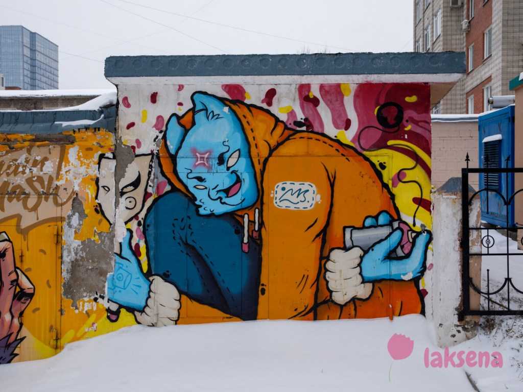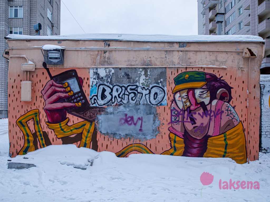 На торце гаражей с Масками нарисован колоритный мужчина с телефоном