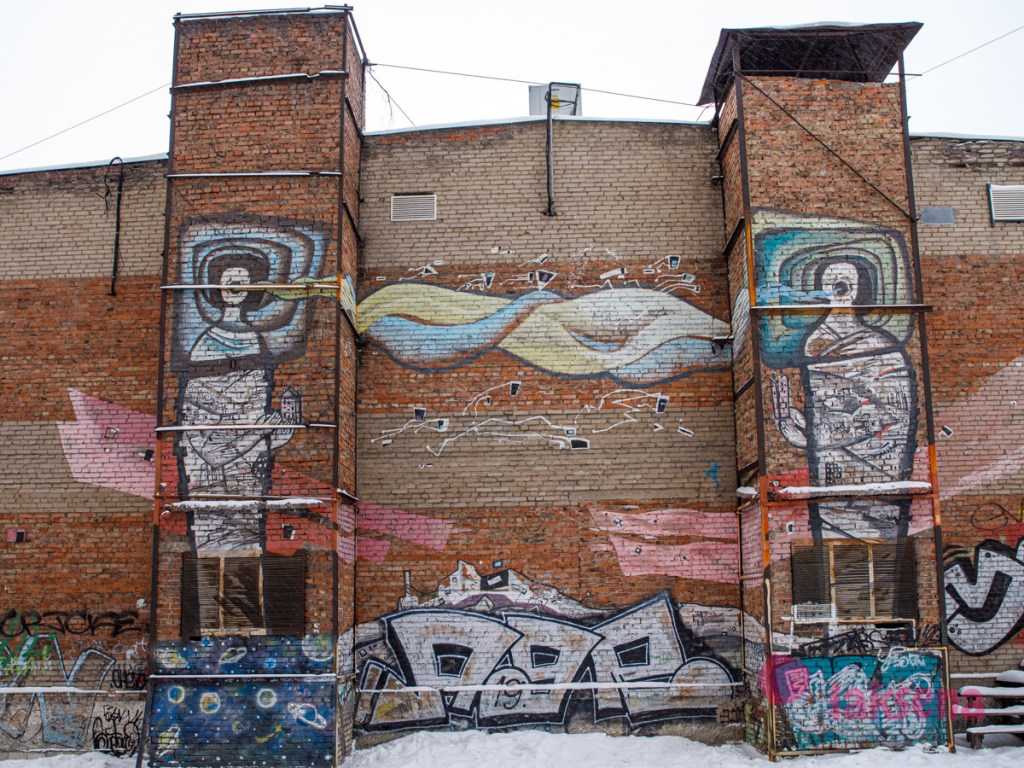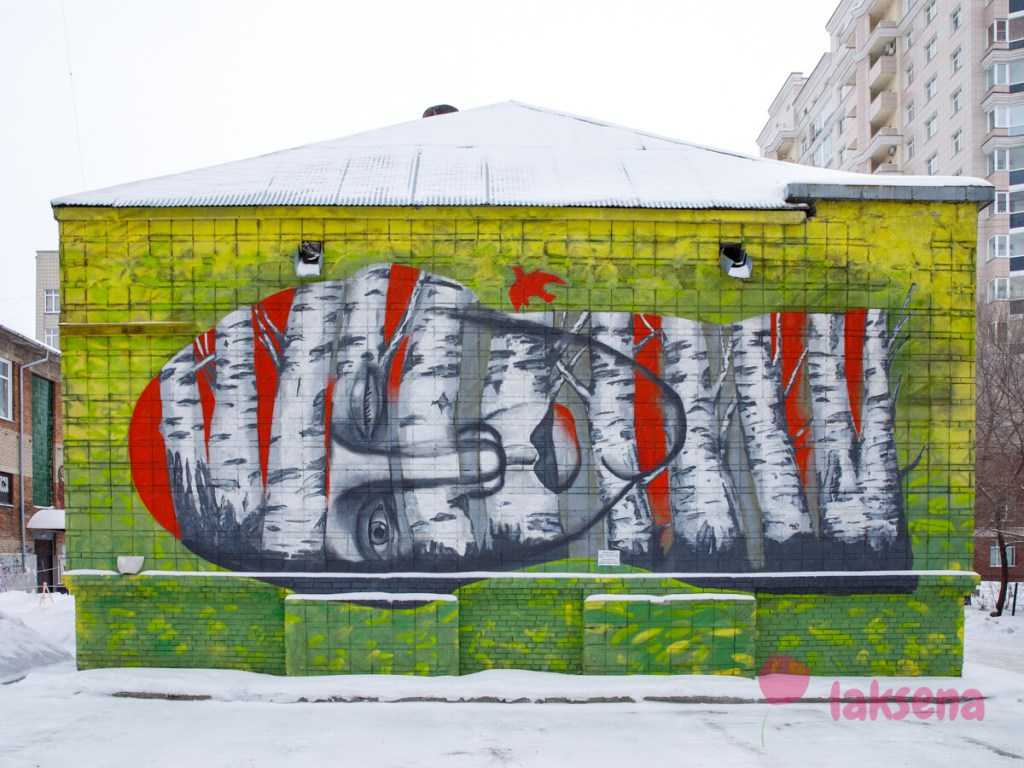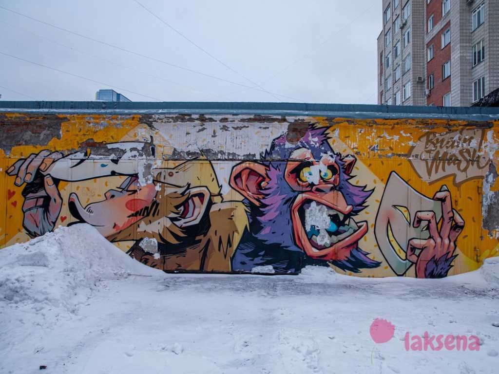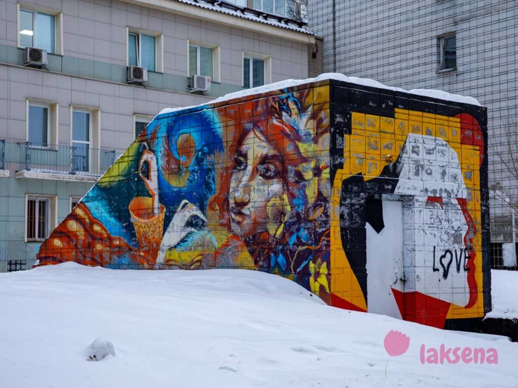 На торце соседнего здания во дворе дома по Романова, 23а еще одна классная работа — композиция «FRENCH KISS» или «Любовь на расстоянии» новосибирской команды «Людистен», в которую входят 5 девушек и 1 парень (все бывшие одногруппники, выпускники 2009-го года НГАХА).