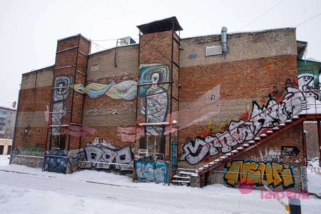 Следующий объект — хозяйственная постройка — украшен граффити с четырех сторон.