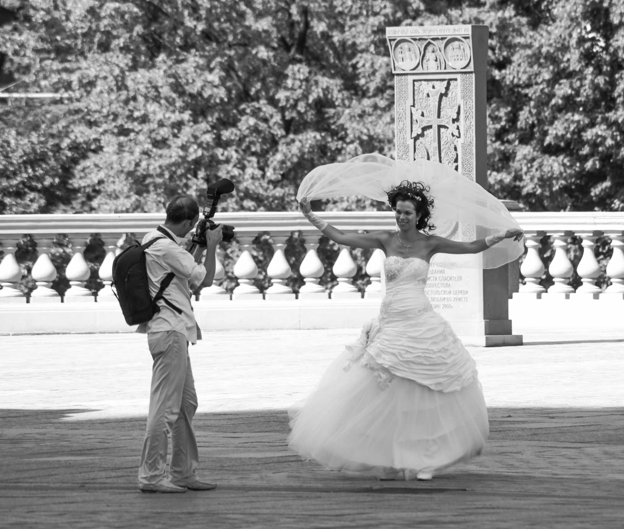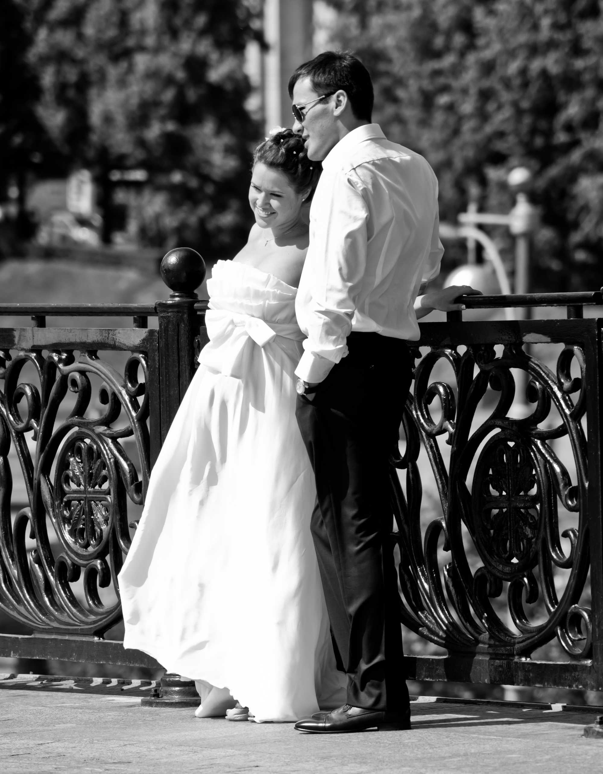 А что же лучше – блуждание по городу в поисках сюжета или выбор места и времени, и ожидание? Сложно сказать. Все зависит от происходящего вокруг. Поясню. Вы решили пополнить свое портфолио фотографиями молодоженов, а на свадьбу вас все не приглашают. Отлично. Думаем, а где водятся эти самые молодожены? В Москве есть несколько мест, где в выходные вы обязательно поймаете парочку свадеб – Патриарший мост и сам Храм Христа Спасителя, Царицино, Коломенское, ГУМ. Теперь решаем, а какой антураж нам нужен. Дальше дело техники – приезжаем на место и выбираем точку съемки – рано или поздно, но молодые попадутся к нам в кадр. Фотографу останется только нажать на кнопку, когда парочка новобрачных или вся веселая свадьба приблизится к точке, которую мы выбрали для съемки.