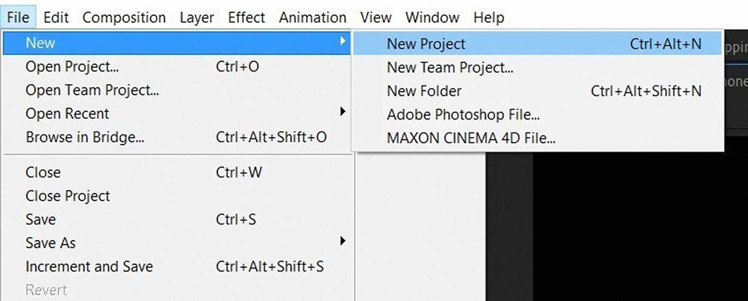 Открываем After Effects и создаём новый проект: File → New → New Project («Файл» → «Новый» → «Новый проект»).