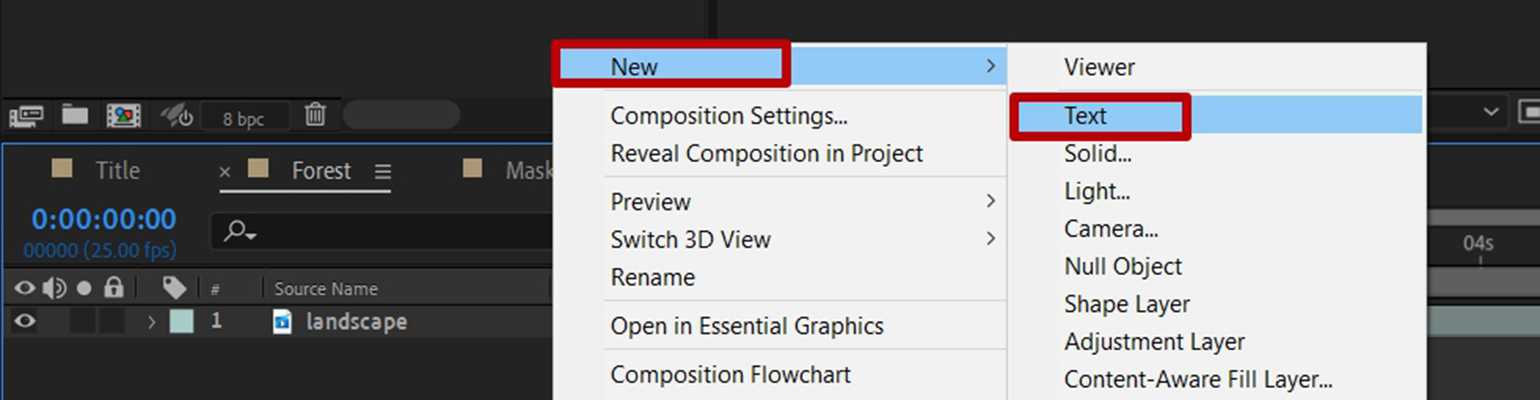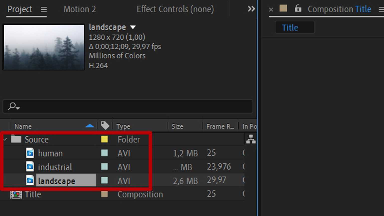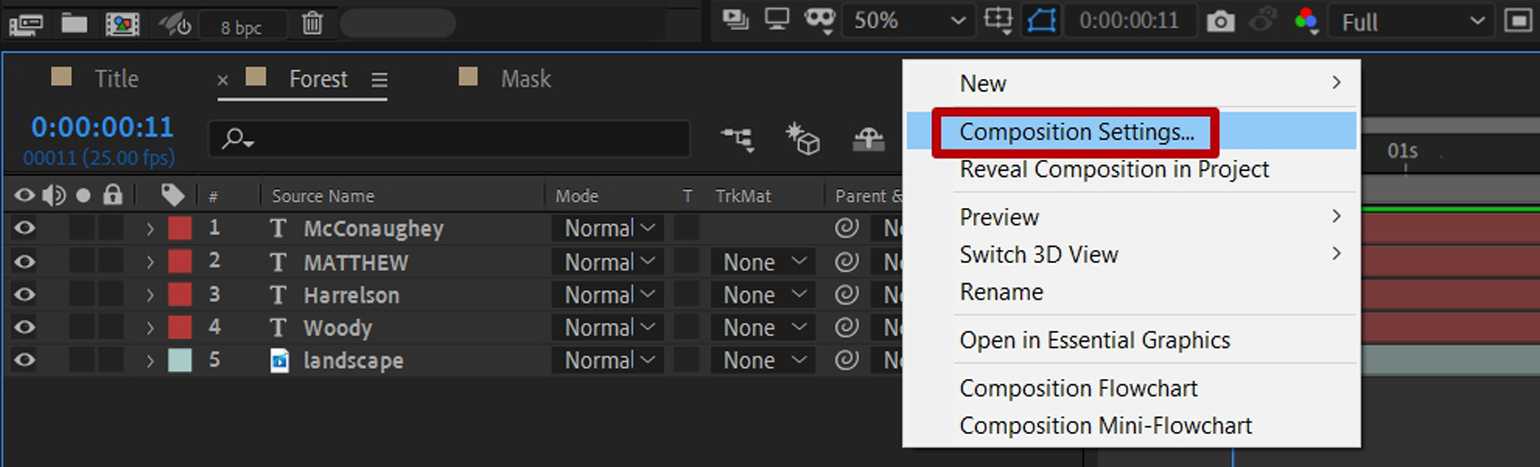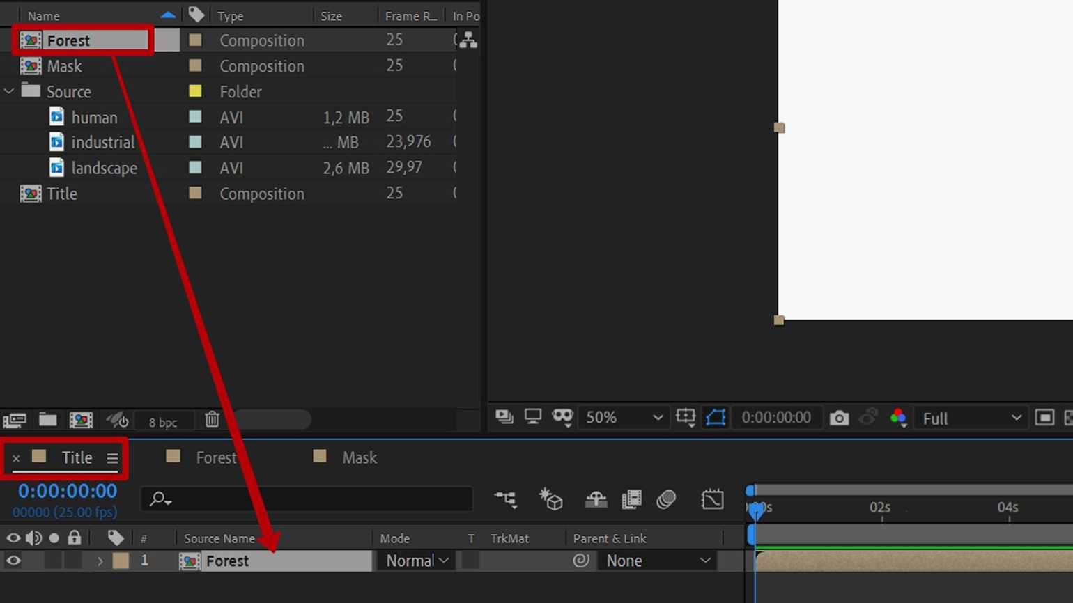 Перенесите композицию Forest на панель слоёв основной композиции Title.