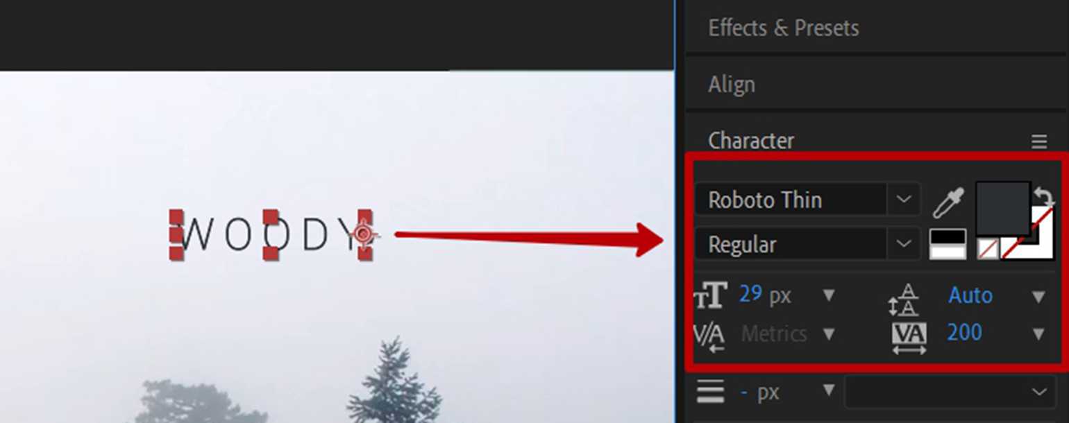 Расположите текстовый блок Harrelson ниже блока Woody и сделайте выравнивание по правому краю, кликнув по соответствующему значку выравнивания на панели Align («Выравнивание»), которая находится выше панели свойств текста.