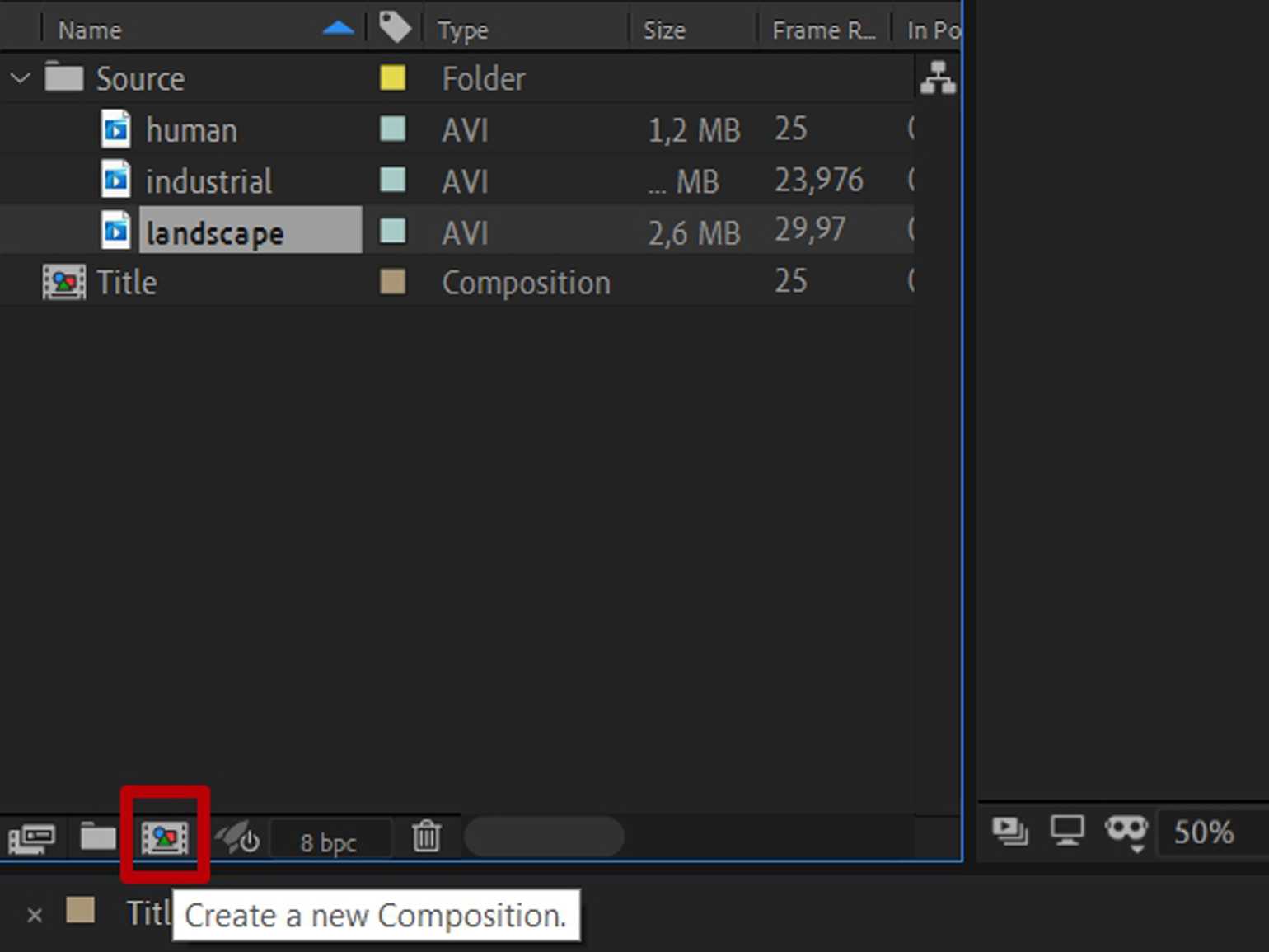 Чтобы создать новую композицию, нажмите в нижней части панели Project на иконку с названием Create a new Composition. Настройки композиции оставьте по умолчанию.