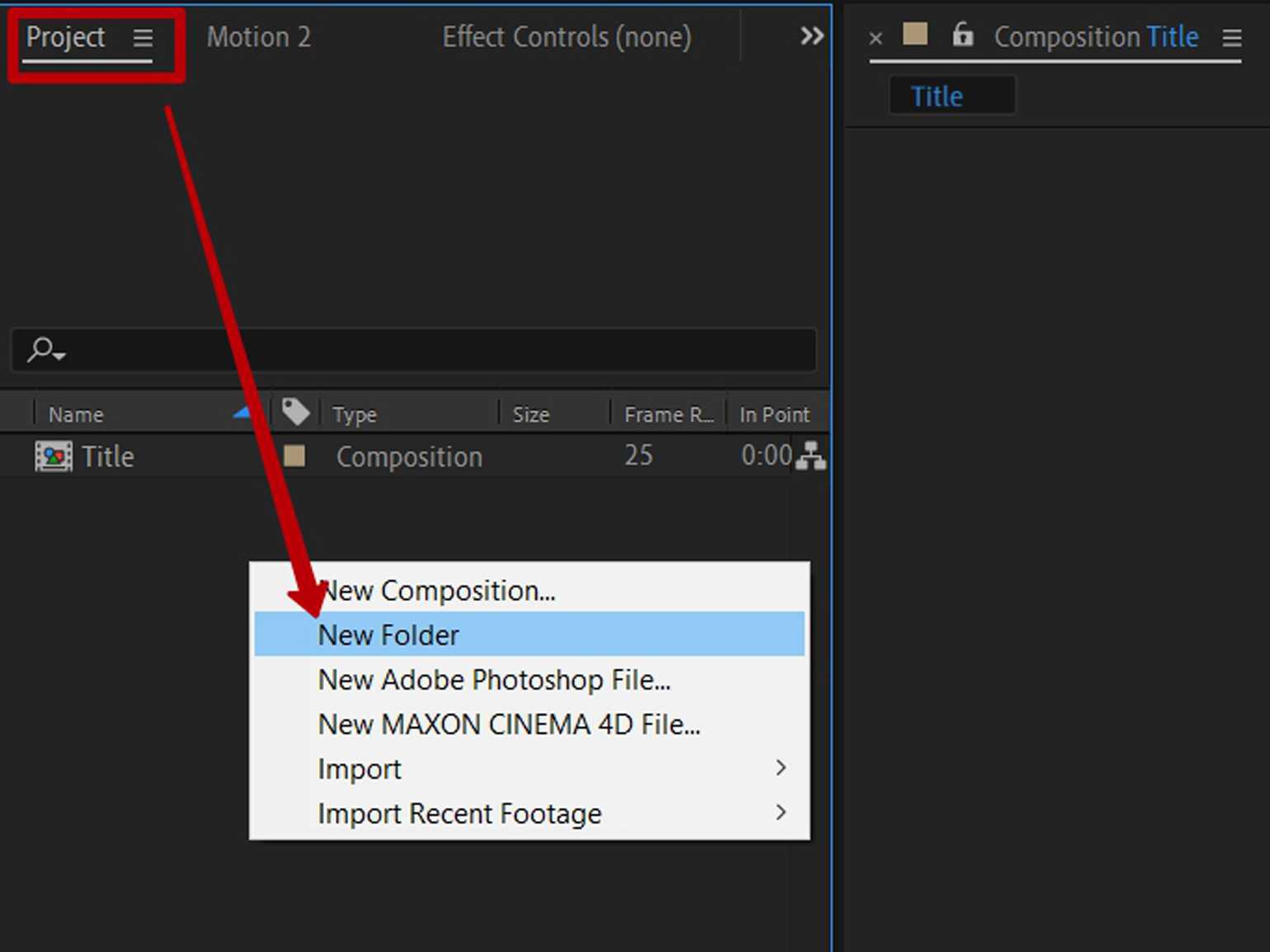 Чтобы импортировать подобранный футаж, перейдите в After Effects, кликните правой кнопкой мыши на панели Project («Проект») и в появившемся меню выберите пункт New Folder («Новая папка») для создания новой папки. Назовите её Source.