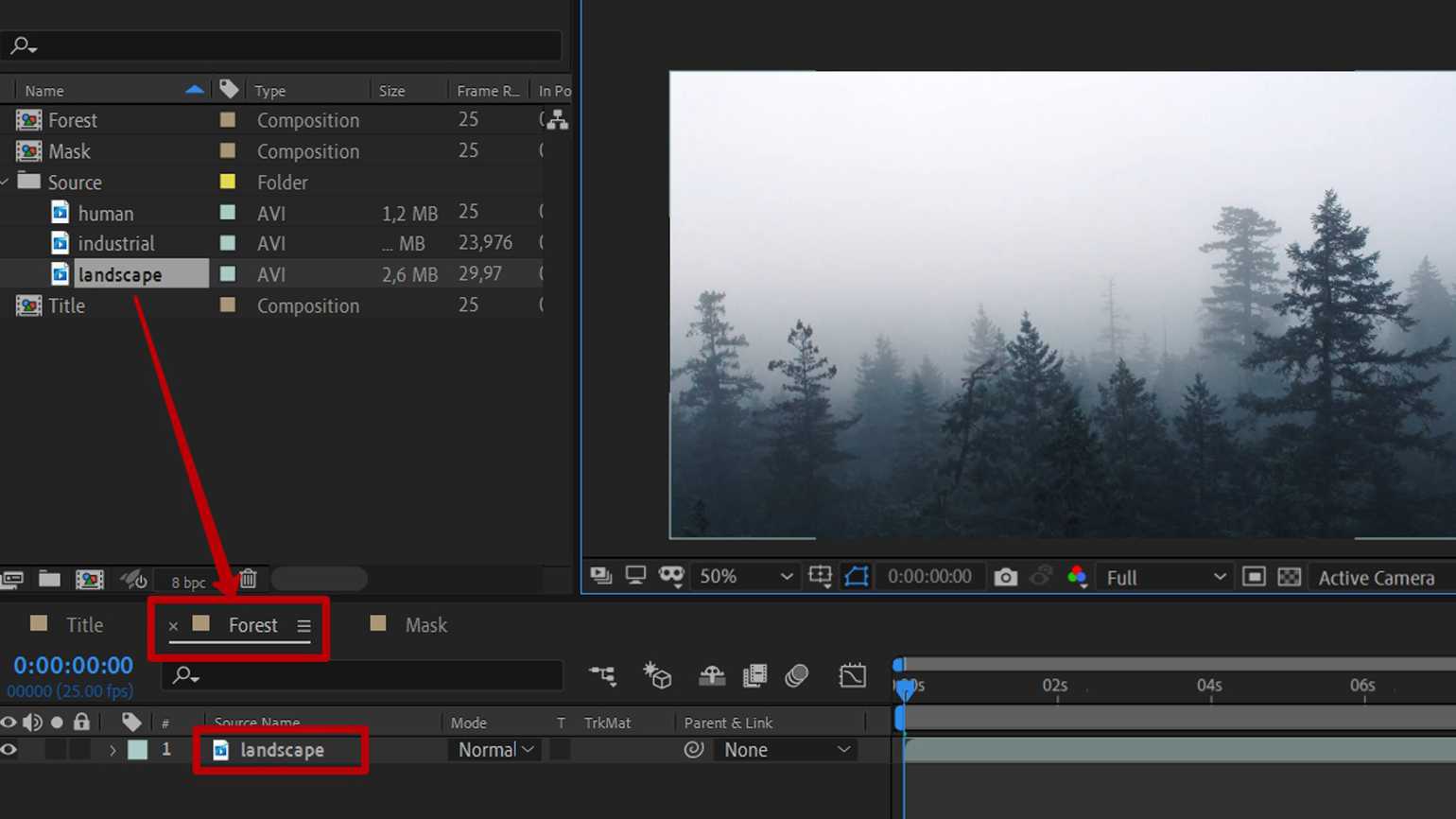 Теперь нужно в композицию Forest добавить видео леса (landscape) из папки Source. Двойным кликом мыши откройте композицию Forest (также это можно сделать, кликнув по вкладке в верхней части панели слоёв) и перенесите туда видео леса, как показано на скриншоте: