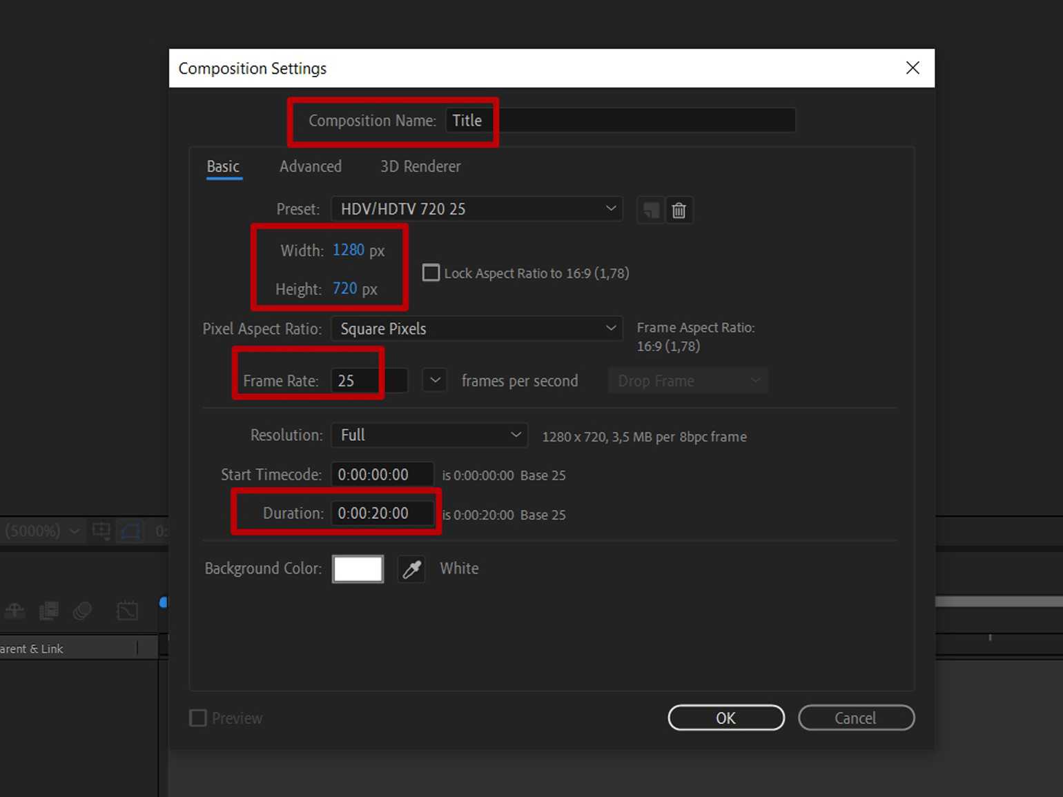 В окне настроек композиции укажите параметры, как показано ниже. Частоту кадров выставите 25, длительность — 20 секунд. Назовите композицию Title.