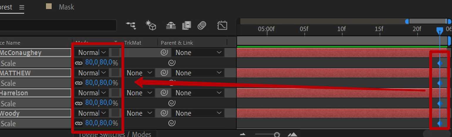 Чтобы создать эффект движения текста, выберем стандартное свойство слоя — Scale. Выделите все текстовые слои и нажмите клавишу S на клавиатуре для выбора свойства Scale всех выделенных слоёв.
