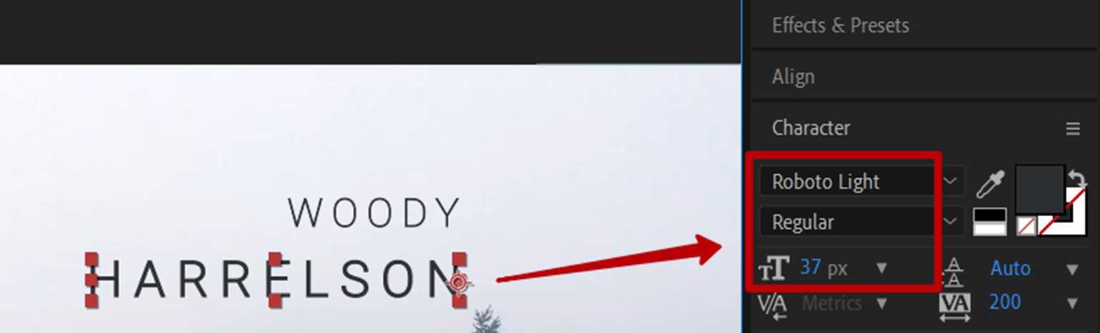 Затем таким же образом создайте текстовый слой для Harrelson, поменяйте размер текста на 37 px, а гарнитуру на Roboto Light.