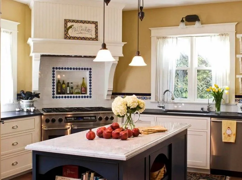 Кухня в стиле кантри с декоративным элементом над плитой Источник pinterest.com