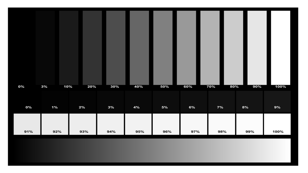 Шкала серого имитирует восприятие яркости и состоит из серии полос разной яркости, начинающейся с полосы пика белого и далее с уменьшением по яркости в 1 / √2 раза на каждой ступени. Глаз ощущает это как равные изменения яркости. Эта логарифмическая прогрессия подобна характеристике чувствительности уха к равным изменениям уровня звука. Шкала серого начинается с полосы 60%-ной отражательной способностью и последующим ее уменьшением ступенями в 1 / √2 раза (0,5 деления шкалы диафрагмы). Фоном служит поверхность в виде кусочка черной не отражающей ворсистой бумаги или черного бархата.