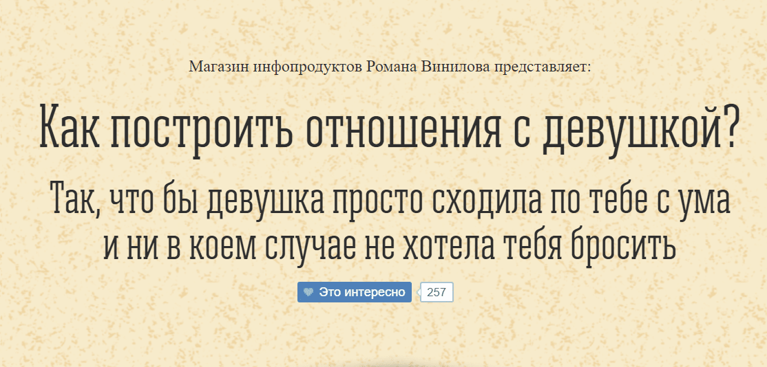Описание. Мне нравятся курсы романа Винилова, нравится его подход. Преподаватель будет учить вас не играть какие-то роли и притворяться, а быть самим собой, настоящим, говорить возлюбленной искренне о своих чувствах. И при этом понимать девушку, делать ее действительно счастливой в отношениях с вами.
