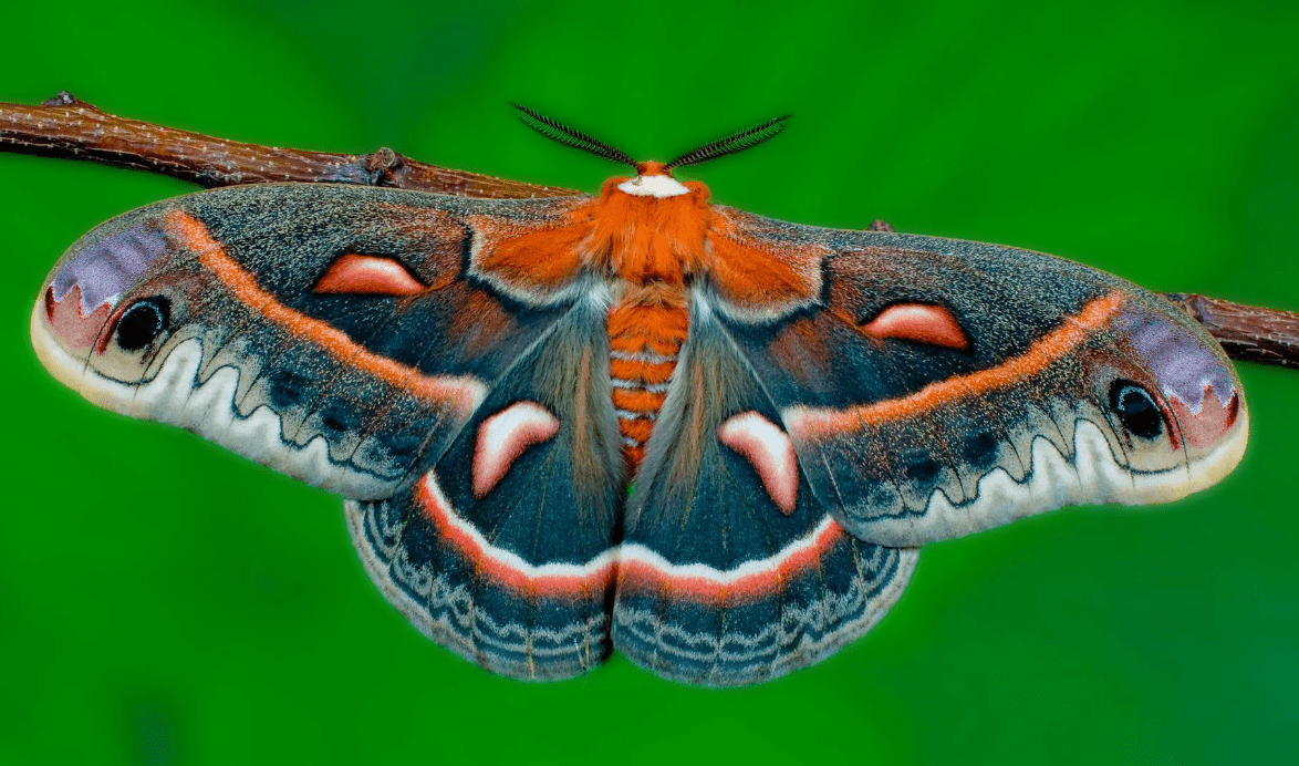 Такую красивую бабочку можно увидеть в США и Канаде, где они любят летать с марта по июнь. Окраска Гиалофоры кекропии достаточно разнообразна – зависит от того, где развивалась куколка. Сама гусеница – зеленого цвета, на ее спинке выросты, напоминающие бутончики – смотрится интересно!