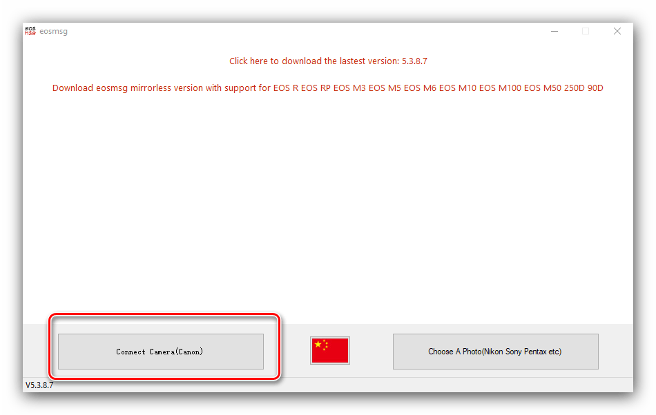 - Откройте EOSMSG и нажмите на кнопку «Connect Camera (Canon)».