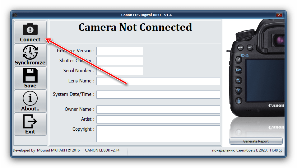 - Дальше запустите Canon EOS Digital Info и нажмите на кнопку «Connect».