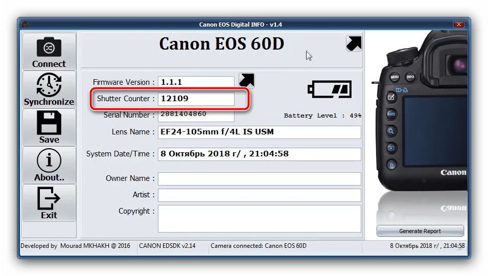 Узнаём пробег фотоаппарата Canon