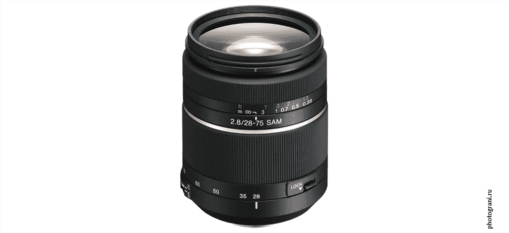 Объектив для полнокадровых зеркальных фотоаппаратов с диапазоном фокусных расстояний от 28 до 75 мм с постоянным минимальным диафрагменным числом f/2,8 по всей длине. SAM (Smooth Autofocus Motor) — объективы с более простым мотором автофокусировки по сравнению с SSM.