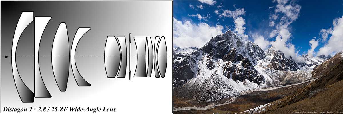 Оптическая схема Distagon и пример фотографии, сделанной объективом Sony A 24mm f/2.0 SSM Carl Zeiss