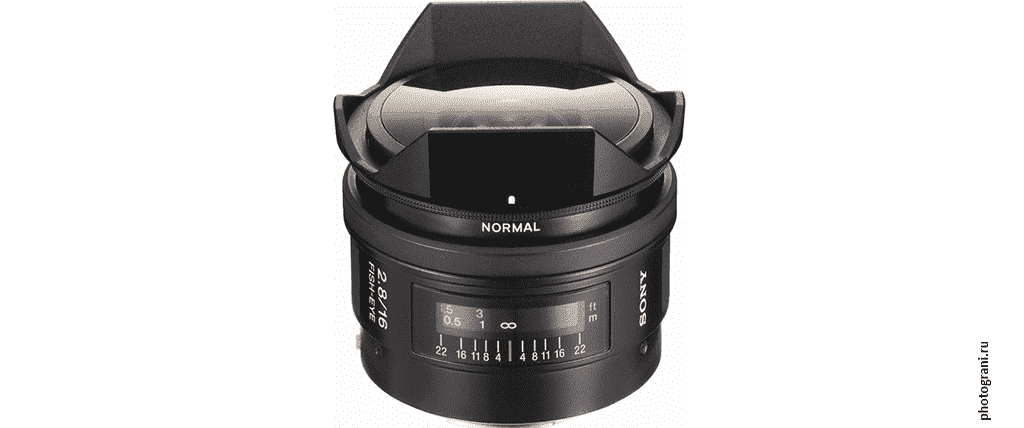 Широкоугольный объектив для полнокадровых зеркальных фотоаппаратов с фиксированным фокусным расстоянием 16 мм и с максимальной диафрагмой f/2.8. Fish-Eye («Рыбий глаз) — объектив с неисправленной дисторсией.