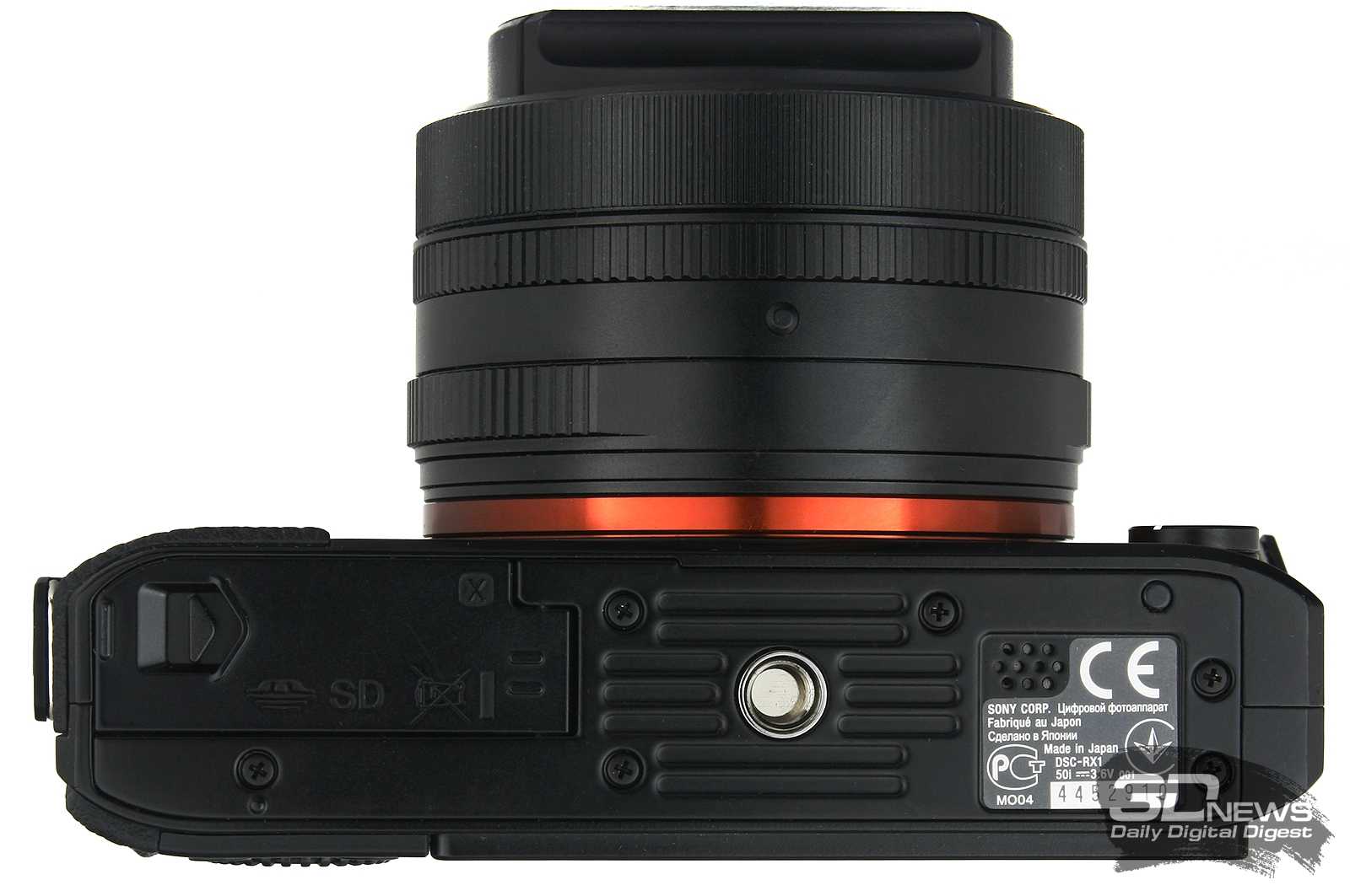 Снизу — стандартный набор функциональных элементов: разъём установки на штатив, динамик и пластиковая дверца, скрывающая слоты для аккумулятора и карт памяти. В столь дорогой камере, лишённой беспроводных средств связи, установка карты памяти под одну крышку с аккумулятором кажется как минимум странным шагом. Ведь, например, при съёмке со штатива для загрузки отснятого материала на ПК приходится скручивать штативную головку либо подсоединять ноутбук к камере при помощи USB-кабеля, что далеко не всегда удобно.