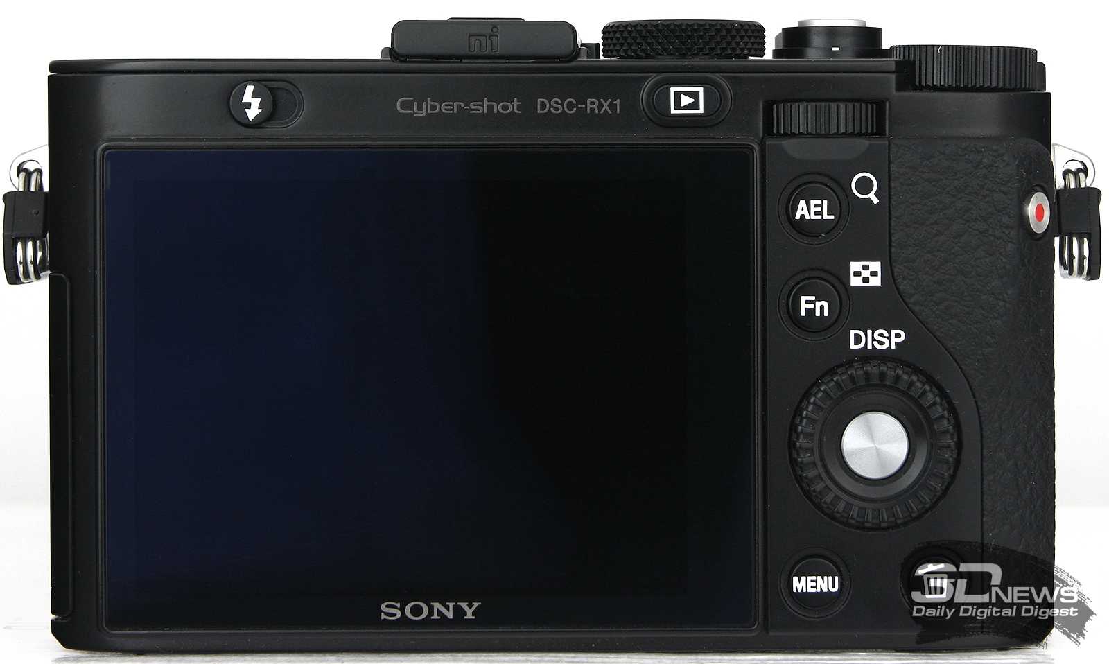 Тыльная сторона не особо загружена, хотя от столь недешёвой камеры подсознательно ожидаешь россыпи клавиш на все случаи жизни. Над экраном установлен ползунок замка подъёмной вспышки, а также клавиша перехода в режим просмотра. Правее находится диск управления, клавиши блокировки экспозиции и вызова функционального меню, которые по совместительству служат для масштабирования снимков, а также кнопка видеозаписи. По центру правого края разместилась круглая четырехпозиционная вращающаяся клавиша навигации с кнопкой ввода по центру. А в нижнем углу установлены клавиши входа в основное меню и удаления.