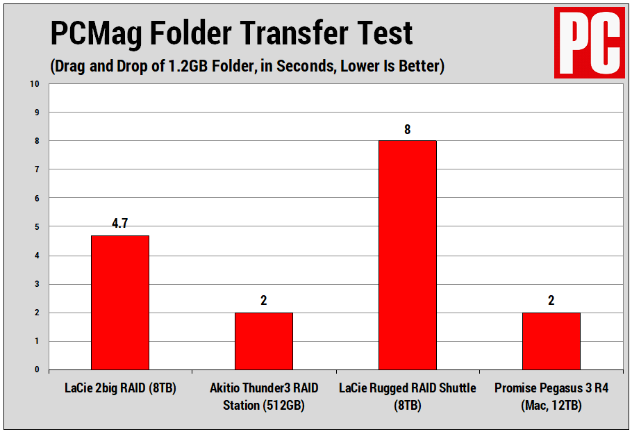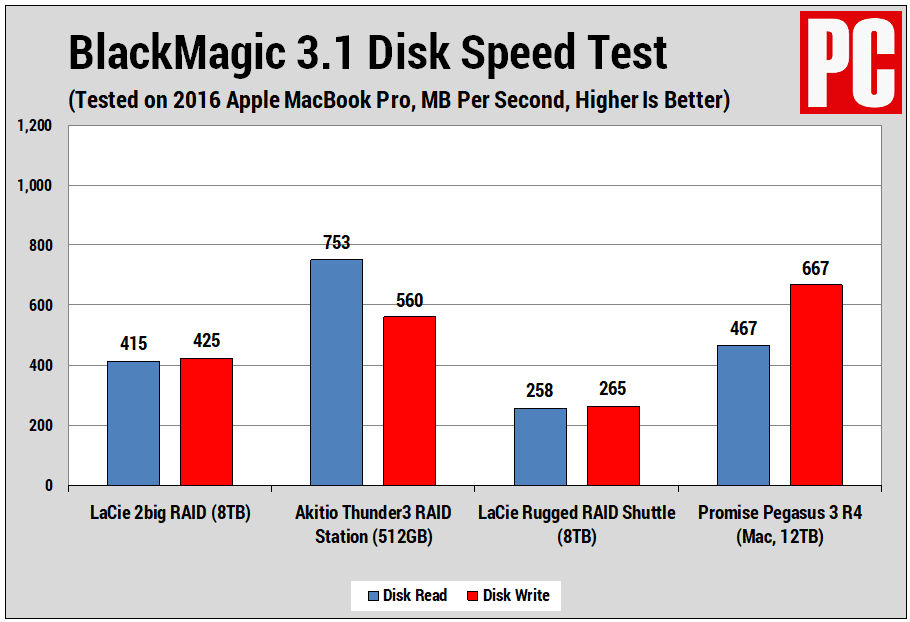 Найти подходящие диски для сравнения производительности было непросто, поскольку «двухдисковый RAID-массив для настольных ПК» — весьма узкая категория. В итоге я расширил поиск (и заглянул в архивы PCMag), включив в него LaCie Rugged RAID Shuttle, который представляет собой жесткий диск, предназначенный для использования в полевых условиях; RAID Station Akitio Thunder3, которую мы тестировали с парой установленных твердотельных накопителей SanDisk U100 емкостью 256 ГБ; и версия Promise Pegasus3 R4 в формате Mac, четырехдисковый массив, протестированный с настройкой RAID 5 по умолчанию — версия RAID, которая распределяет данные по всем четырем дискам таким образом, чтобы все ваши данные были доступны, даже если один из них выходит из строя. . Все остальные диски были настроены на RAID 0, который используется по умолчанию в каждом случае и обеспечивает максимальную производительность.