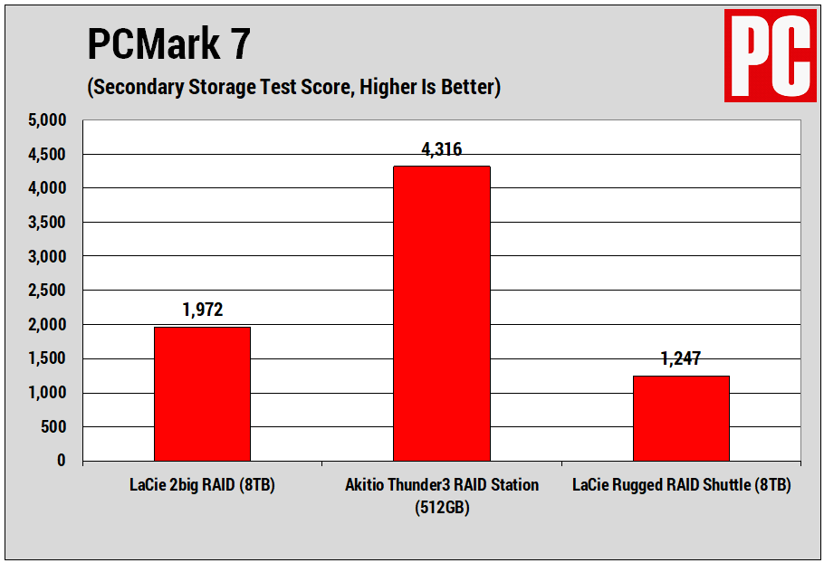 Результаты сравнения были полностью предсказуемыми. RAID-станция Thunder3 с ее быстродействующими твердотельными накопителями опережает остальных; Pegasus3 R4 с его массивом из четырех дисков 7200 об / мин в RAID 5 занял сильное второе место; LaCie 2big RAID, также с дисками 7200 об / мин, занял третье место; и LaCie Rugged RAID Shuttle с дисками на 5400 об / мин, проигравшими все тесты. В конечном итоге 2big RAID обеспечил достаточно высокую производительность без каких-либо сюрпризов.