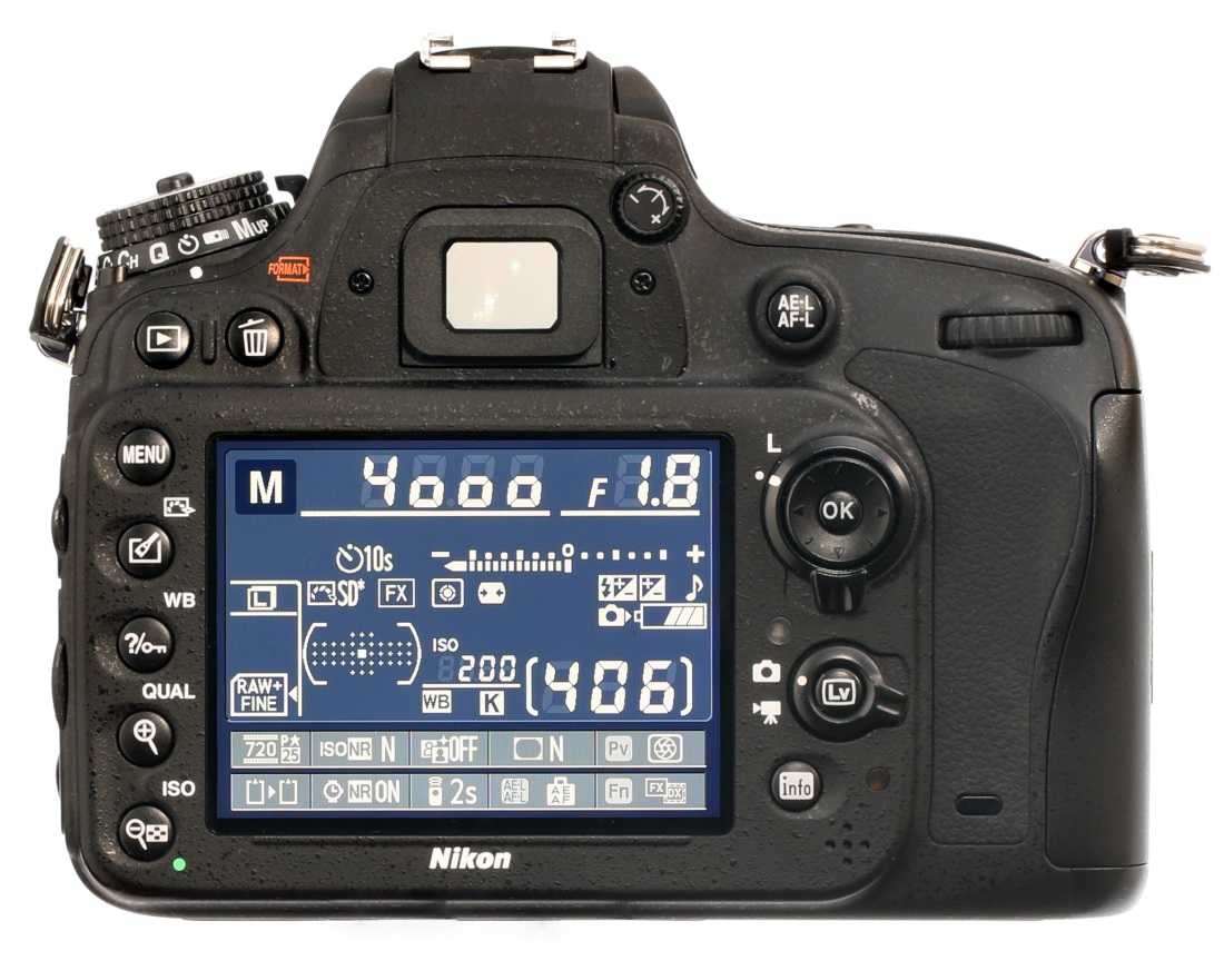 Матрица: 35.9×24.0 мм CMOS. 24.3 миллиона эффективных пикселей.Экспозамер: матричный, центровзвешенный, усредненный, точечный.Эффективный размер матрицы: полнокадровый, 35.9×24 мм CMOS-сенсор.АЦП: 12-битный, 14-битный.Байонет: Nikon F.Режимы экспозиции: Авто, программный, приоритет выдержки, приоритет диафрагмы, ручной.Непрерывная съемка: 5.5 кадров в секунду в режиме FX.Память: карты SD/SDHC/SDXC UHS-I. Два слота.Размер изображения (в пикселях): 6016×4016 — 1968×1112. Видео: 1920×1080, 1280×720 при скорости 24/25/30 к/с.Видоискатель: Оптический (пентапризма) плюс ЖК-дисплей с диагональю 8.1 см.Поддерживаемые форматы: NEF (RAW), JPEG, NEF (RAW)+JPEG, MPEG4.Цветовое пространство: Adobe RGB, sRGB.Светочувствительность ISO: Авто, от 100 до 6400. В расширенном режиме от 50 до 25 600.Интерфейсы: USB 3.0, AV, HDMI mini, DC вход, внешний стерео микрофон, выход для наушников, ПДУ.Питание: Перезаряжаемая литиево-ионная батарея, AC-адаптер.Габариты: 141x113x82 (ШхВхГ).Вес: Около 850 г. (с батареей и картой памяти).
