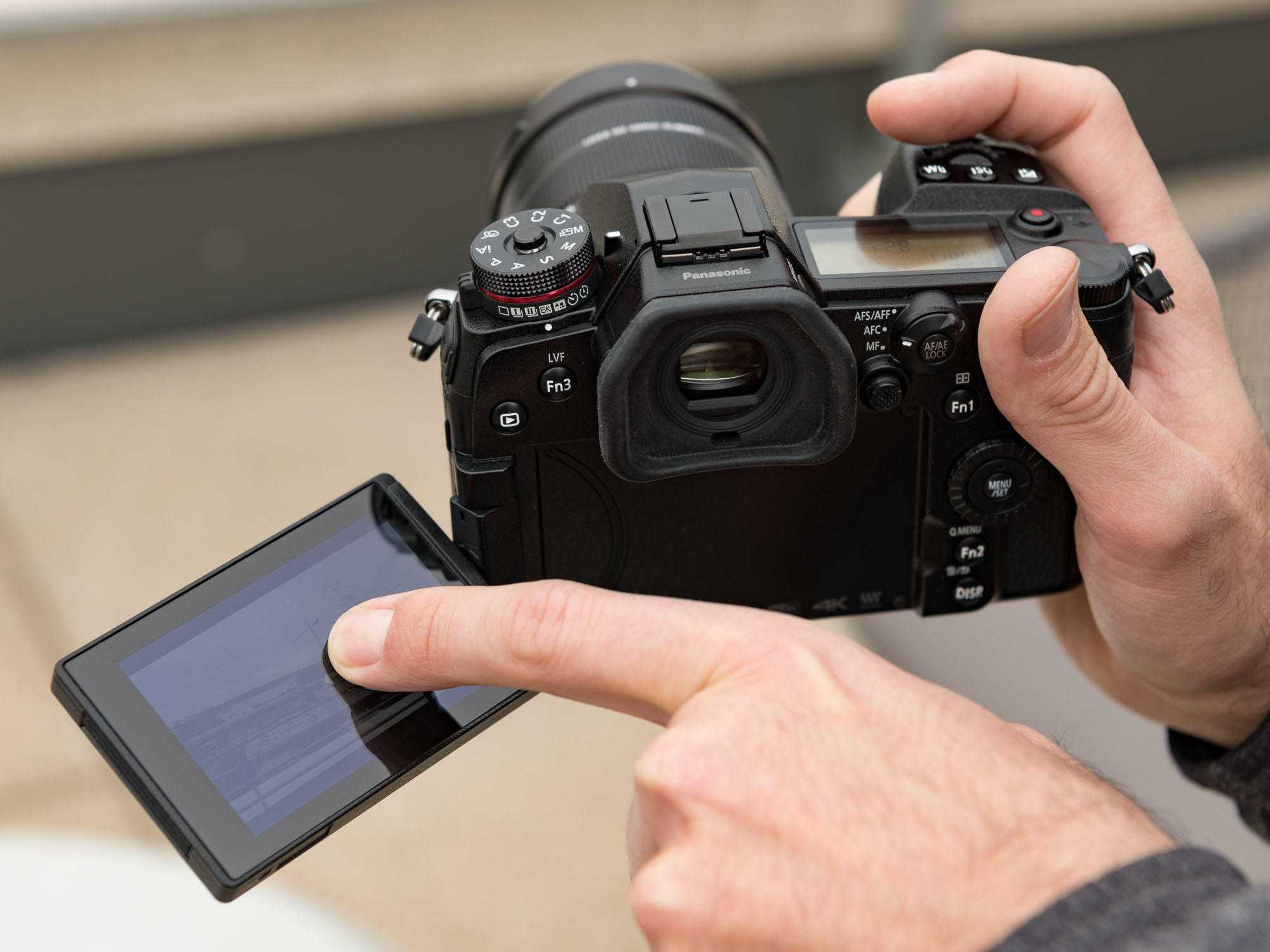Остальное пространство на задней панели занимает наклонный трехдюймовый экран. Он оснащен сенсорной поверхностью, что будет удобно для тех, кто привык к подобному способу управления в современных гаджетах: с помощью прикосновения пальца можно задать точку фокусировки и быстро листать меню. По сравнению с GX8 увеличено разрешение экрана с 1,04 миллиона (720 × 480) до 1,24 миллиона точек (1280 × 720).