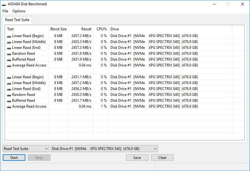 | AIDA64 Disk Benchmark | Средняя скорость чтения – 2457,2 Мбайт/с Рандомное чтение – 2431,8 Мбайт/с Чтение из буфера – 2431,9 Мбайт/с Время доступа при чтении – 0,04 мс |