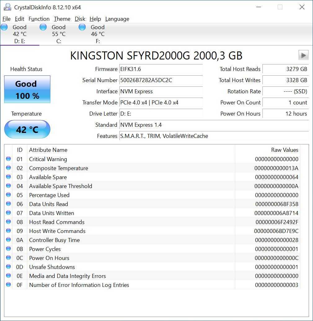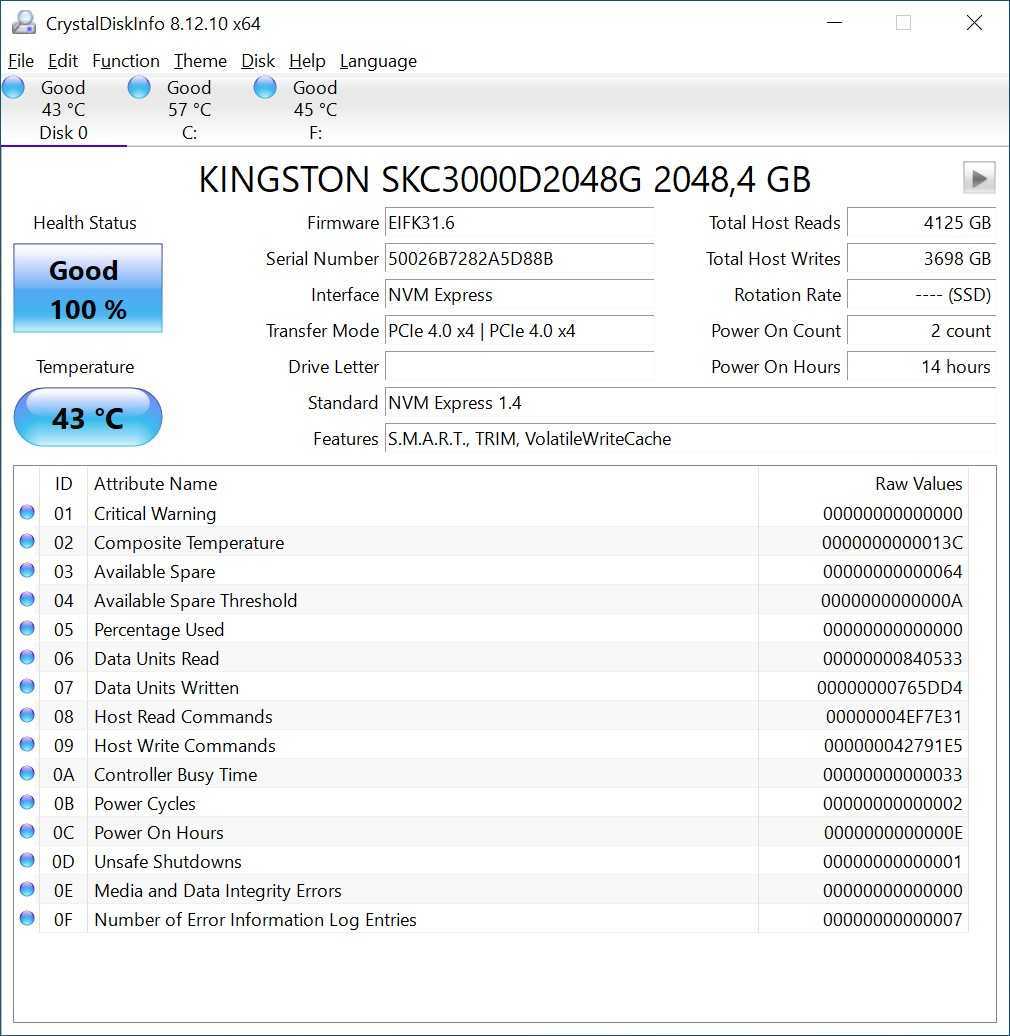 Среднее энергопотребление Kingston KC3000 заявлено на уровне 0,34–0,36 Вт, в то время как пиковые значения при чтении данных могут составлять 2,8 Вт, а на операциях записи старших моделей – до 10,2 Вт.