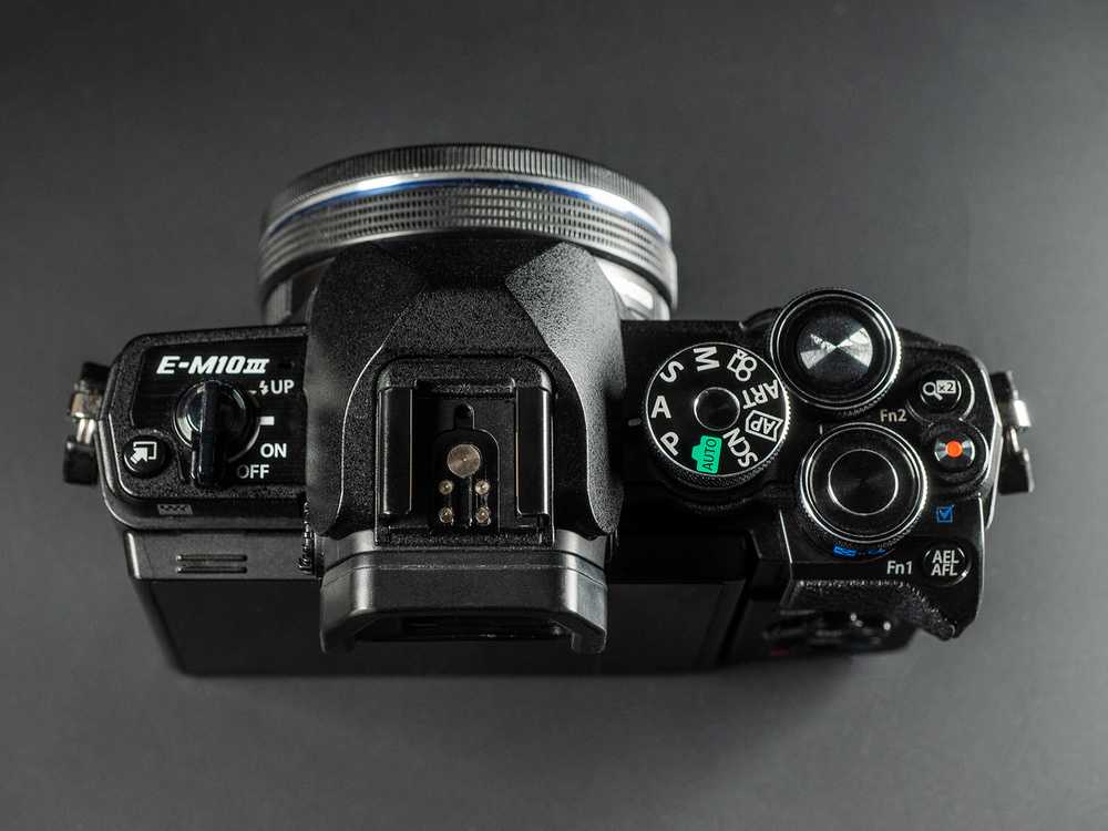 Аппарат OM-D E-M10 Mark III оснащён встроенной вспышкой. Она расположена над объективом, поднимается и убирается вручную. Для её поднятия используется рычажок включения питания, а для опускания — нажатие пальцем сверху.