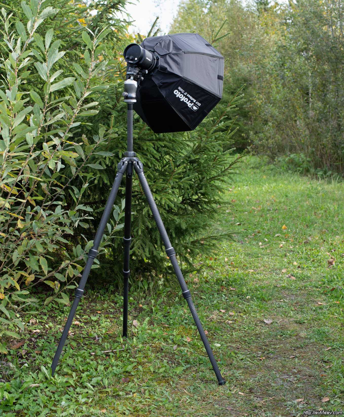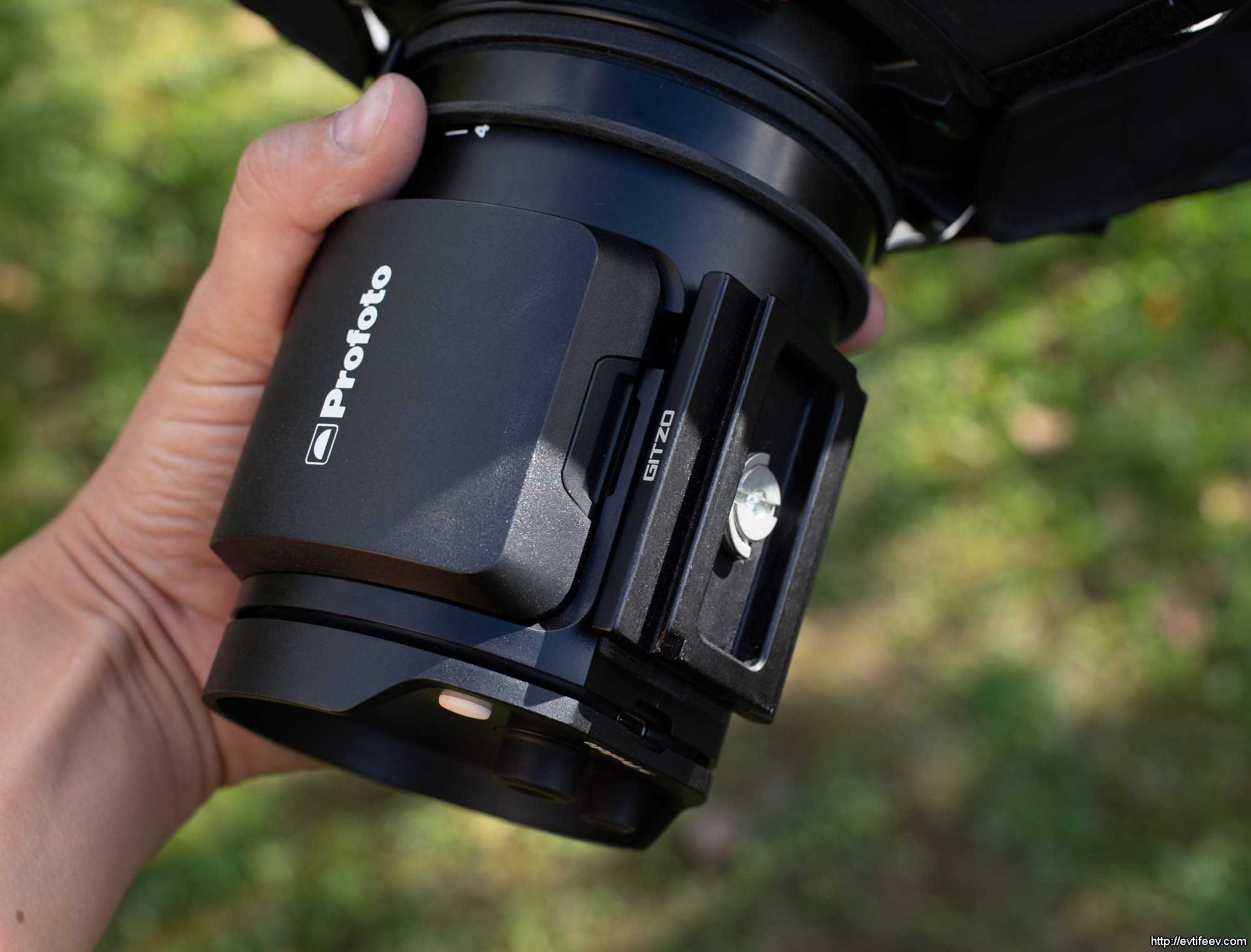 У вспышки Profoto B10 в нижней части есть гнездо под штативную площадку, что очень удобно использовать на природе т.к. позволяет установить вспышку особенно надежно т.к. хороший штатив намного устойчивее легкой студийной стойки. В данном случае я использовал свой любимый штатив Gitzo 3532.
