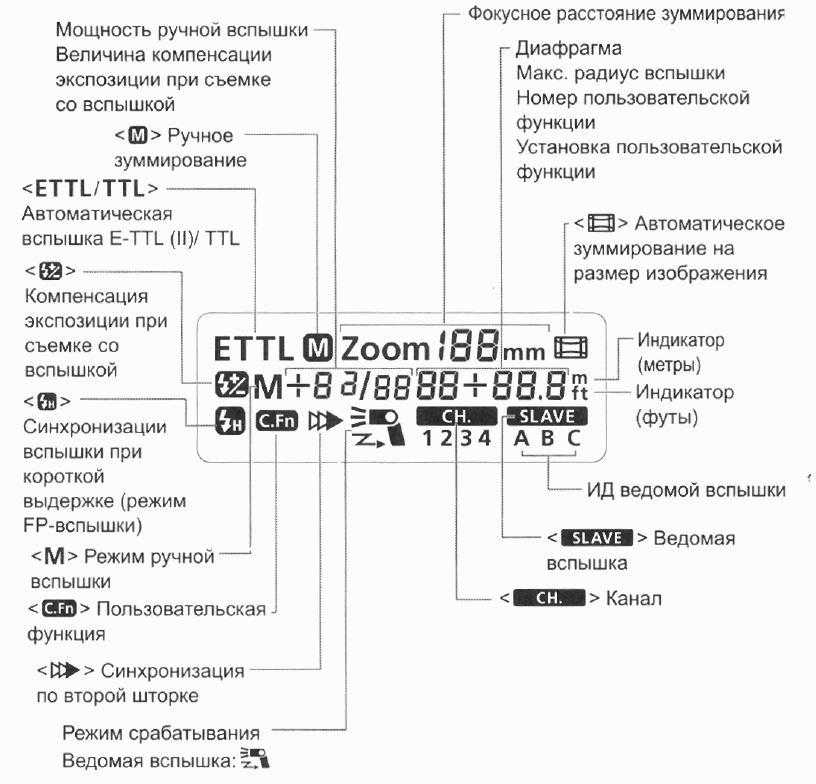 Матричный, имеет зеленую подсветку. Подсветка активируется однократным нажатием кнопки C.Fn (Custom Functions) и гаснет через 12 секунд. На дисплее отображаются режимы работы вспышки. Все, что необходимо, пропечатано на дисплее заранее (экономия заряда должна быть экономной).