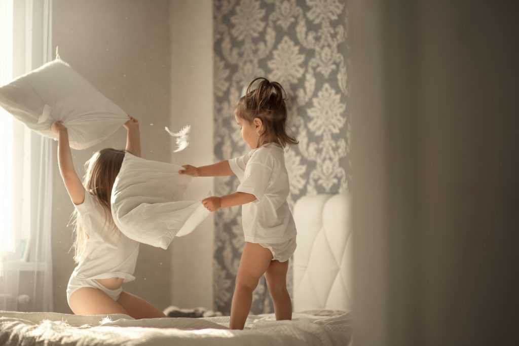 Просто сядьте все вместе на диван или расположитесь на кровати. Маленьких детей можно подкинуть в воздух, что смотрится довольно оригинально. А как вы относитесь к бою подушками? А на фотографиях это выглядит просто потрясающие. Очень интересно использовать при съемках разный реквизит.