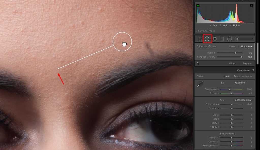 С помощью инструмента Spot Removal Tool в данном изображении мы удалим всего несколько веснушек и пятен, которые отвлекают внимание. Нажмите “Q” на клавиатуре или выберите его на панели инструментов выше панели Basic
