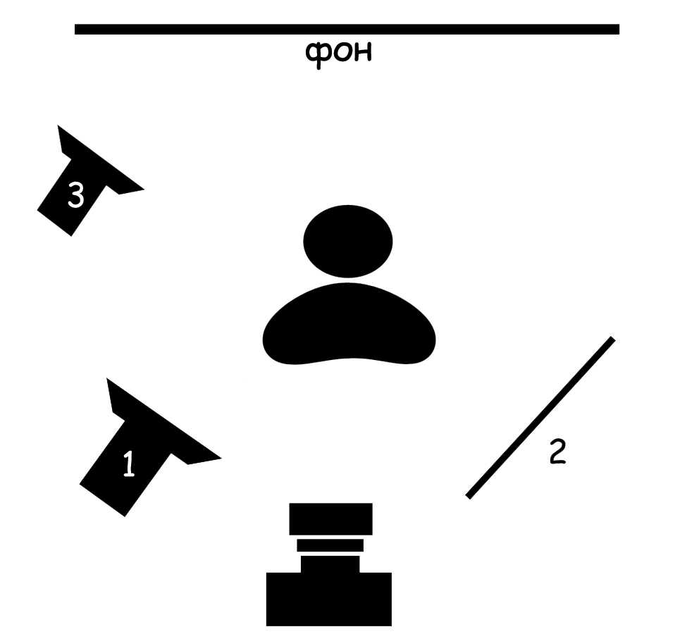 Есть готовые схемы света в студии, используя которые несложно быстро добиться правильного эффекта, не тратя время на выбор местоположения светильников. Можно разобраться в нескольких, чтобы подобрать те, которые больше всего подходят под определенные условия.