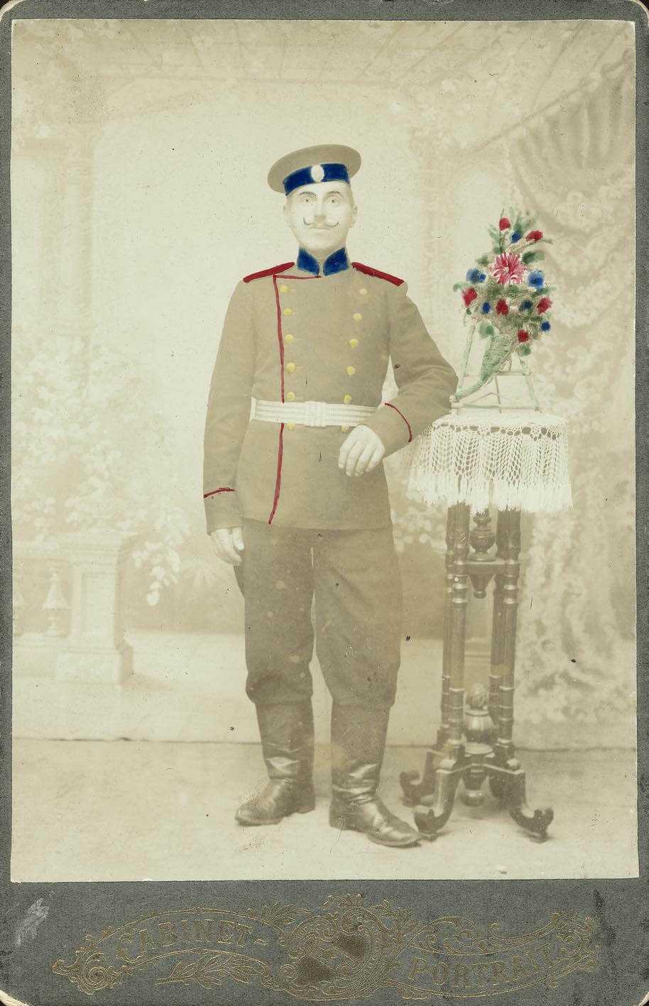 Ателье «Фотография Бр. Крохв». Солдат 146-го пехотного Царицынского полка 37-й дивизии, Ямбург, Май 1910. Аристотипный отпечаток, акварель. Собрание Мультимедиа Арт Музея, Москва